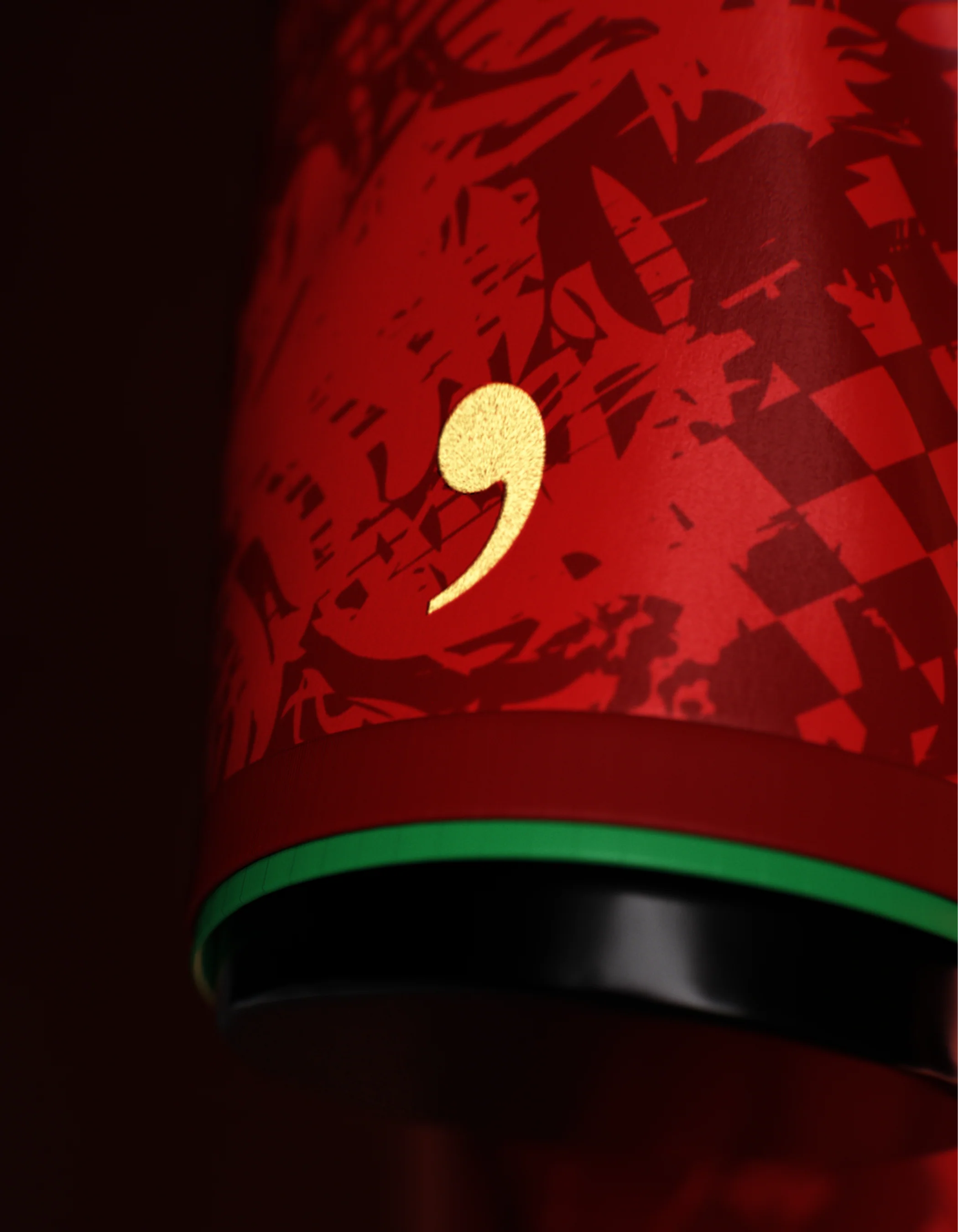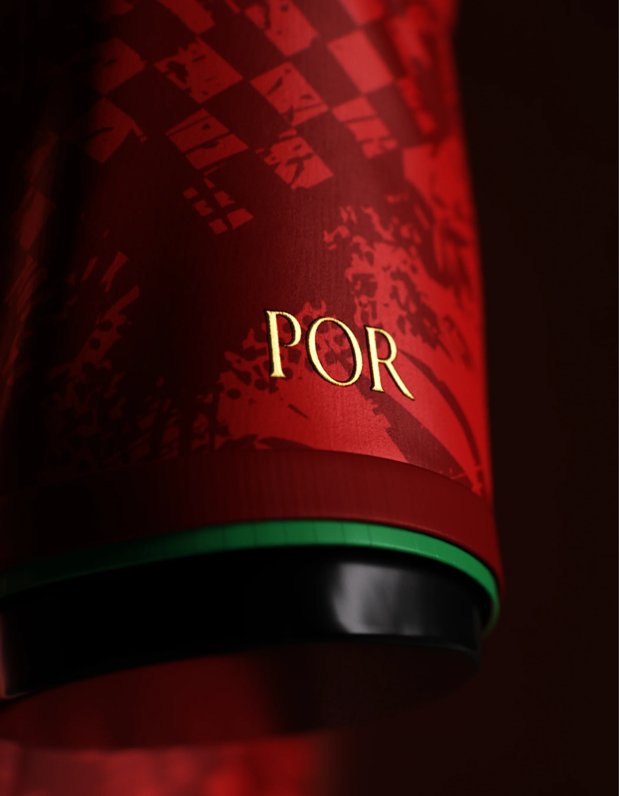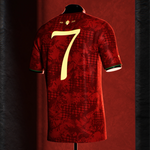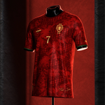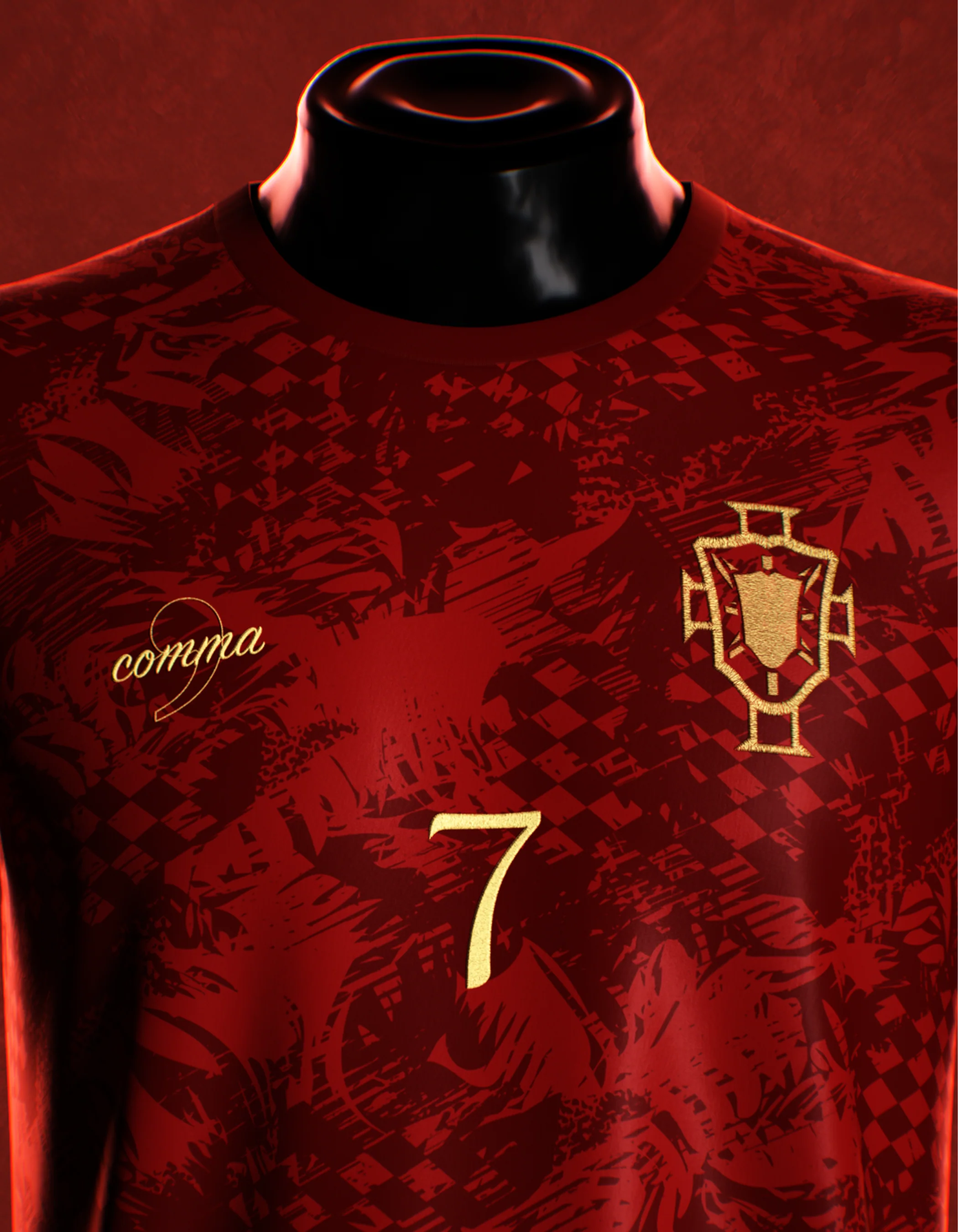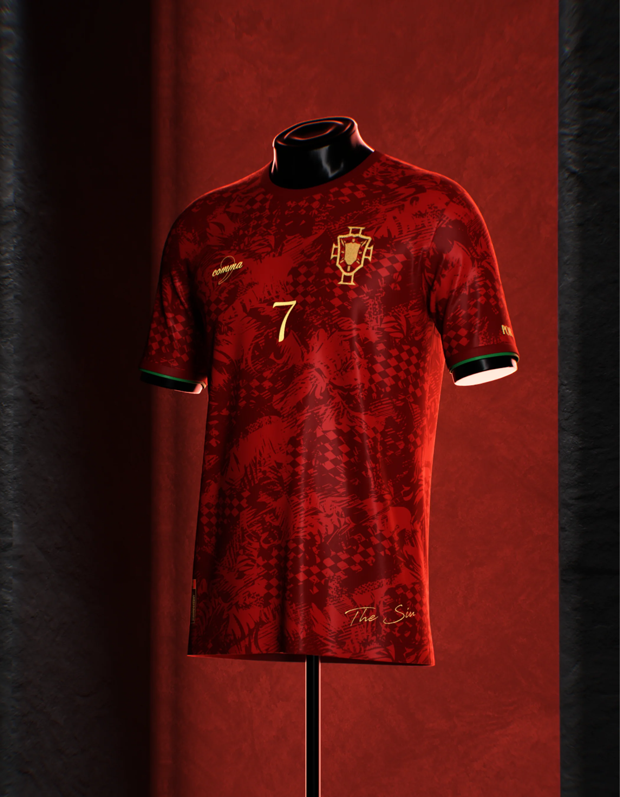A deep red jersey featuring a dynamic pattern inspired by the Portuguese spirit, embroidered gold detailing, and our signature two-layered sleeve cuffs. All topped off with The Siu's signature Number 7.